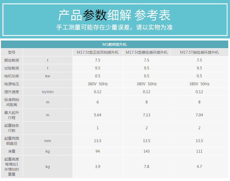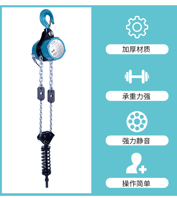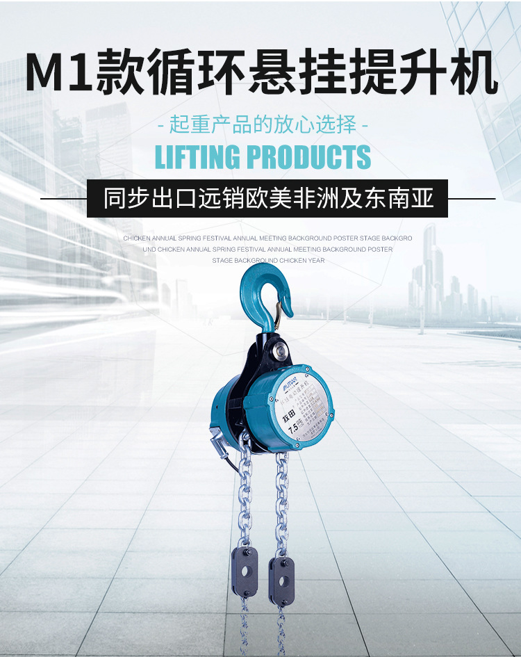 M1款循环悬挂提升机 ●三大内部部件性能变现的提升 1、减速机全部采用行星齿轮寿命长、易拆解、噪音低; 2、十字形导链器有效避免卡链现象; 3、产品配件采用特殊钢加工体积小、